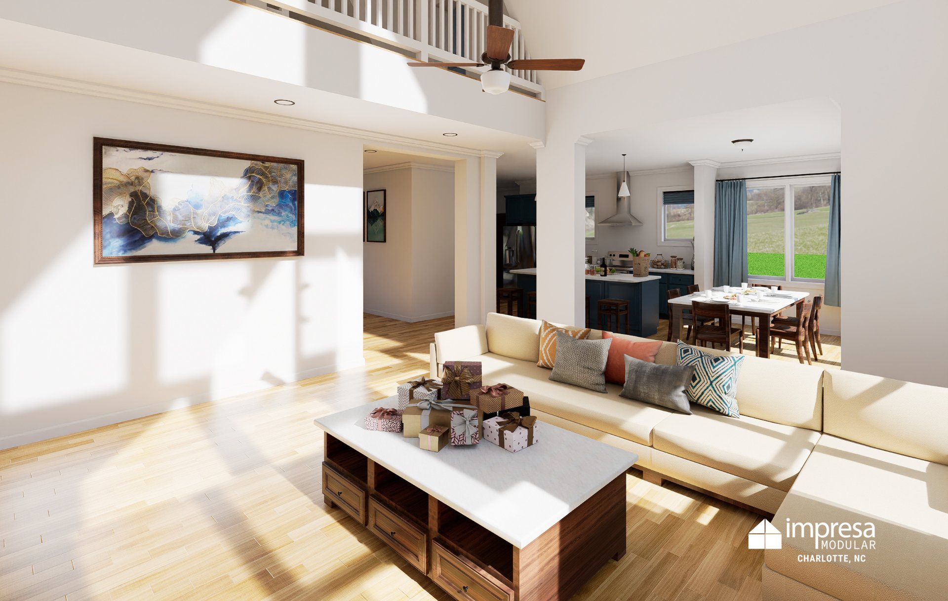 A primary focus of the design was maintaining openness within the main living spaces while preserving structural integrity in a modular build format.